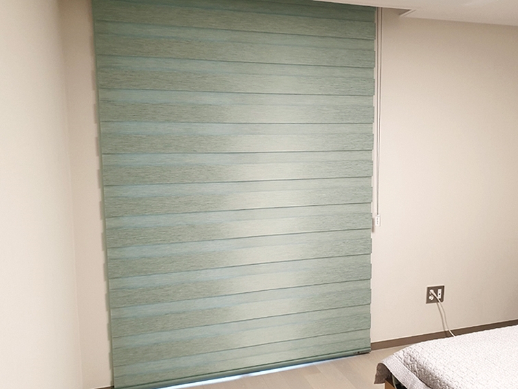 빛을 차단해주는 효과를 극대화 하기 위해서 암막원단을 적용하였는데요, 색상은 그린색상으로 안정감 있는 편안한 색감을 사용하였으며, 암막효과를 극대화하기 위해서 블라인드 나눔 제작없이 하나의 블라인드 제작방식으로 설치하였답니다.