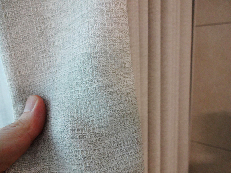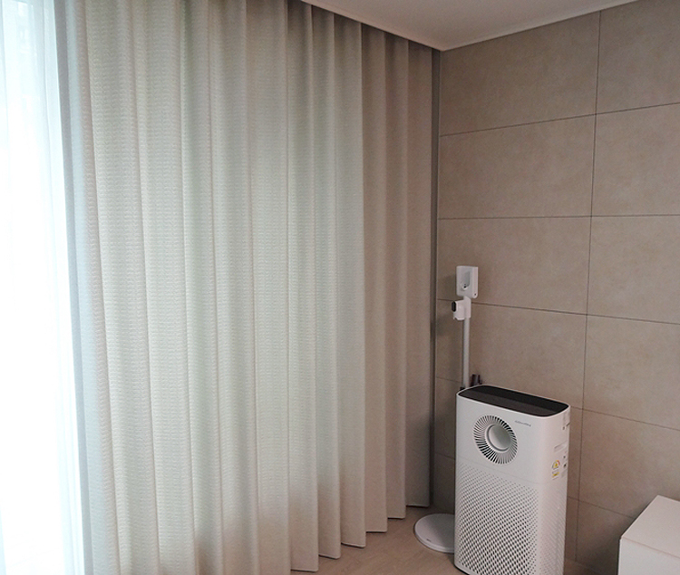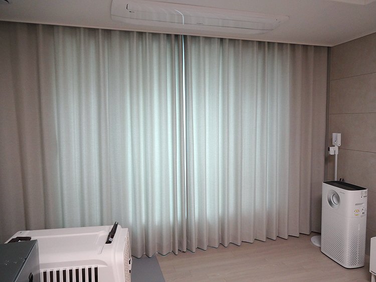 걷지 커튼으로 사용한 원단은 결 디자인 살짝 들어간 고급스러운 종류를 사용하였는데요 색감은 벽면 대리석 느낌과 비슷한 라이트 그레이 색상을 선택하였답니다.