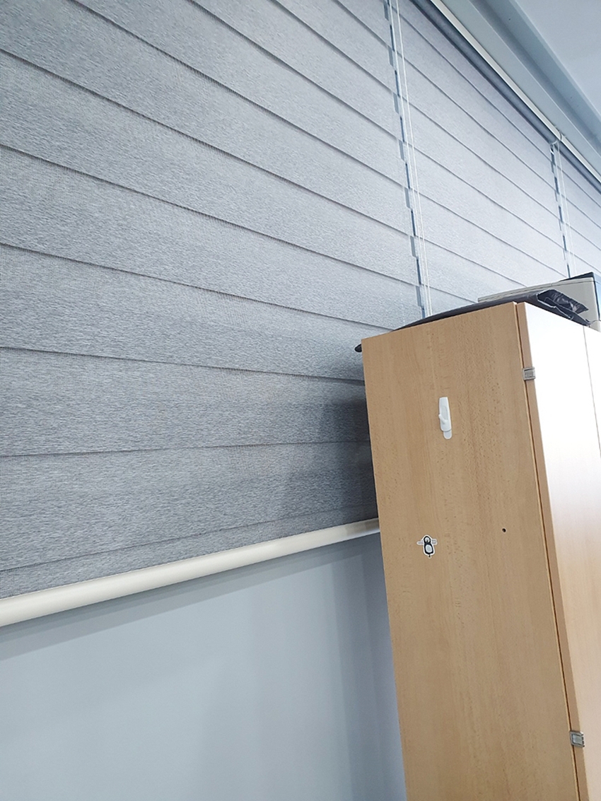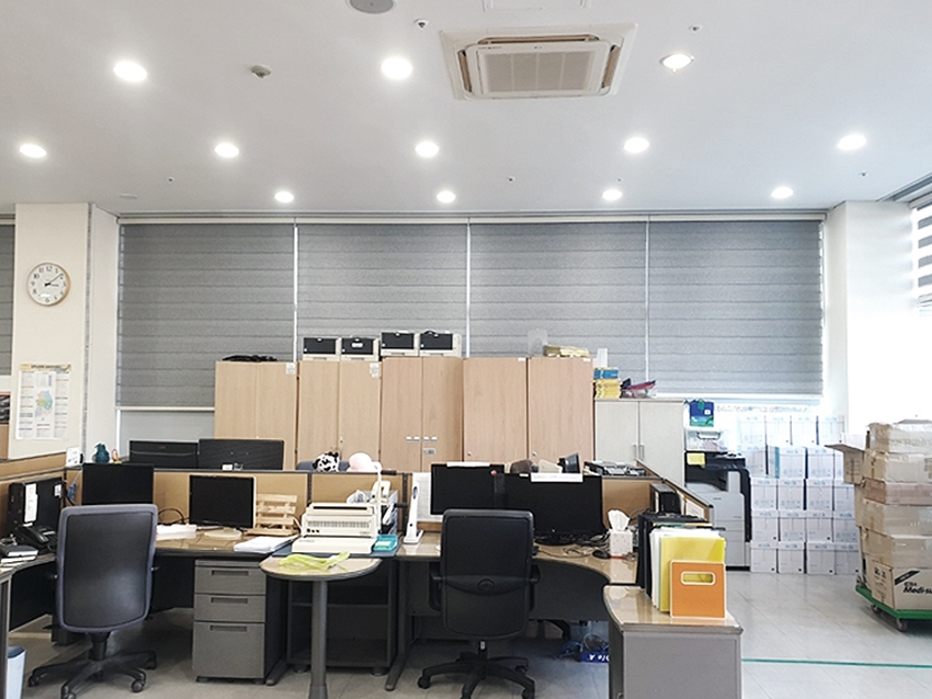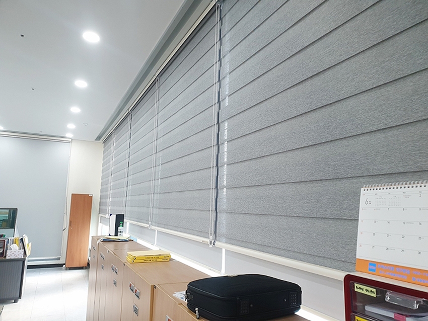 기존에 사용중이던 블라인드 뒷편으로 자외선 열기차단 방염 암막블라인드를 더하여서 설치하였답니다.