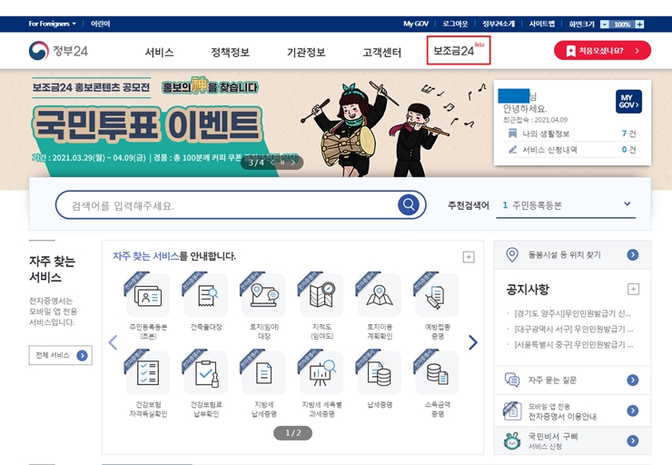 2021년 4월 보조금 24 정부지원금 사이트 오픈