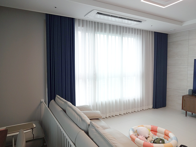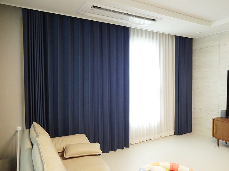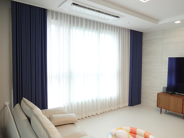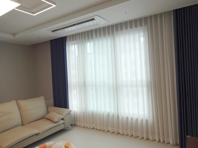 색상이 예쁜거실 이중 커튼 디자인입니다.