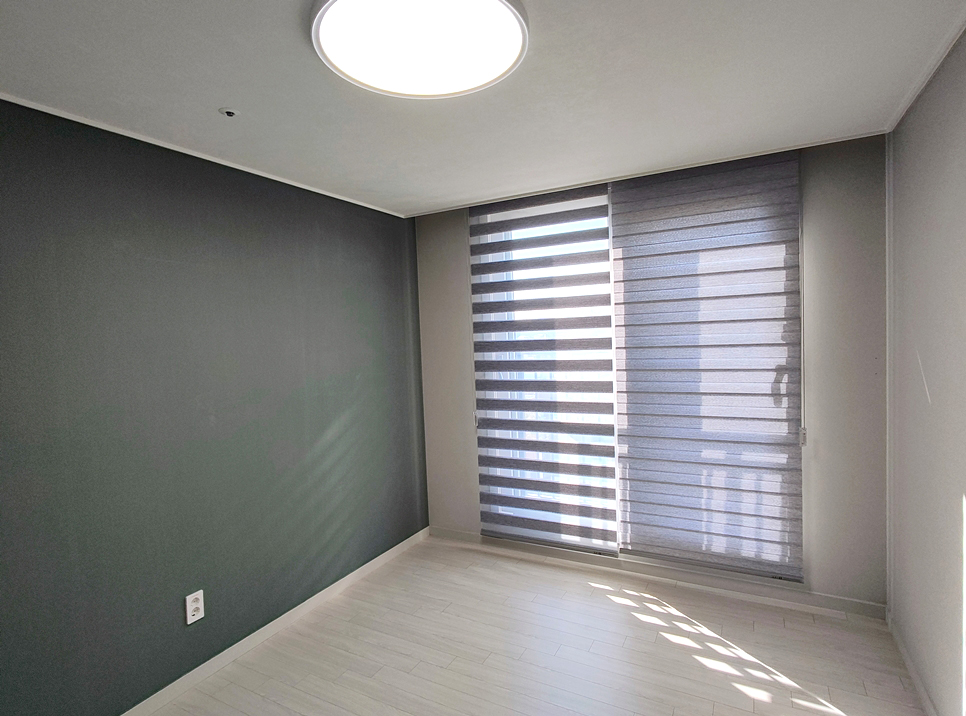 신축형 드레스룸 창문 구조에는 사진처럼 쪽 창문으로 이루어진 공간이 보이는데요 암막롤스크린 블라인드 하나로 제작하여서 창문 자체를 덮어서 사용하는 방식으로 설치하였답니다.