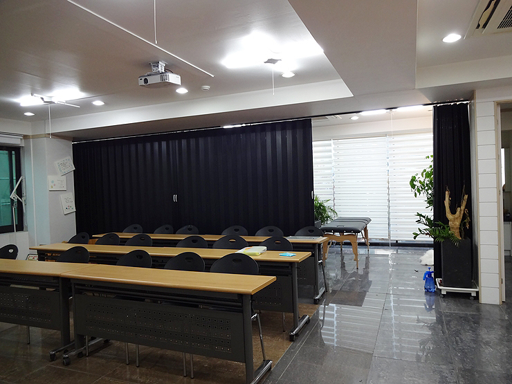 공간을 나누어주는 홀딩도어 자바라 설치 장면인데요 넓은 공간 강의실 및 상담실 구분으로 사용하게 해주고 필요에 따라서 넓은 공간으로 크게 사용하는 편리한 활용성을 자랑하는 홀딩도어 자바라입니다.