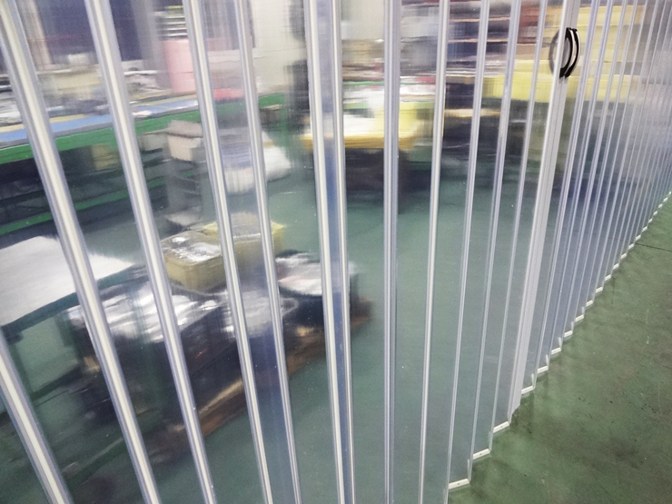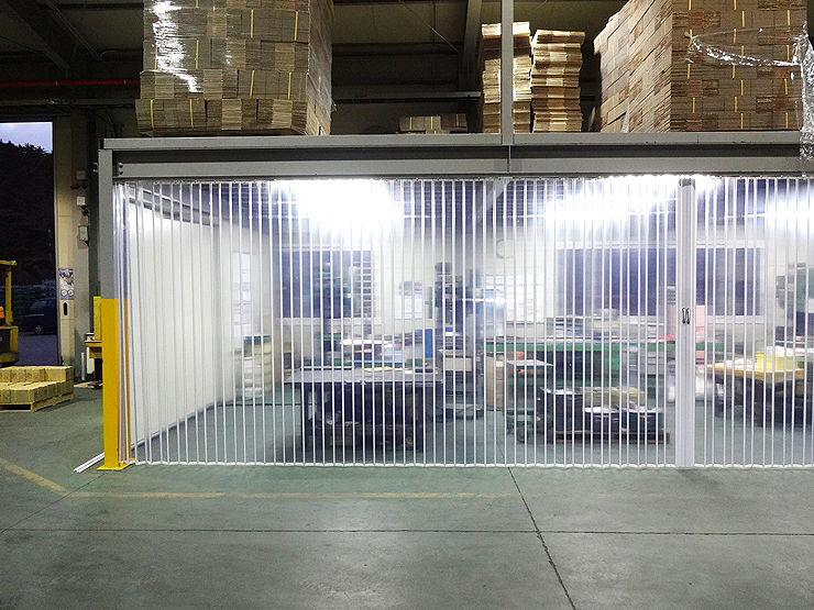 작업 공간이기도 하지만 보여지는 부분이 필요하기에 투명색상 홀딩도어를 선택하고 설치하였답니다. 공간이 넓은 장소에 설치한 만큼 열려지는 폭이 넓어서 물품 상하차 공간이 확보되어야 하는 현장인 만큼 접혀서 사용되는 홀딩도어 자바를 선탁하였답니다.