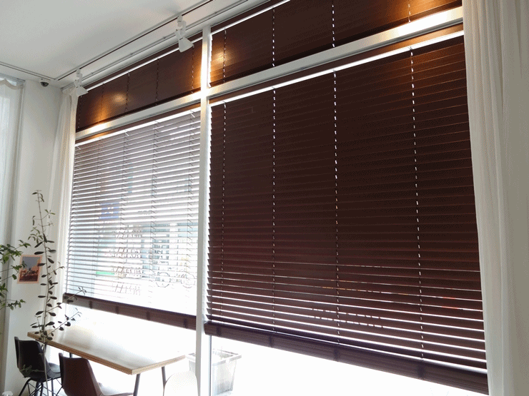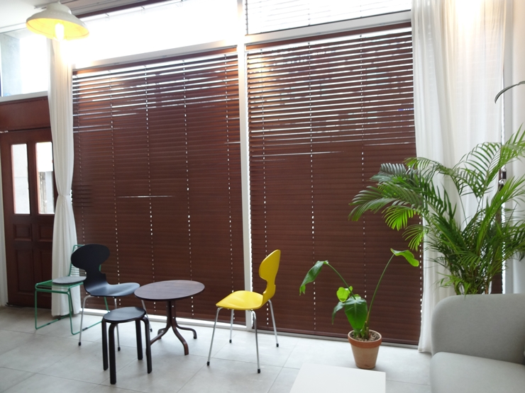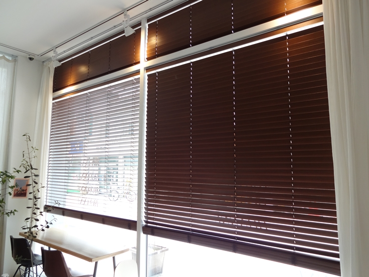 카페에는 출입문 밤색 나무 색상을 기준으로 일체감을 주는 우드블라인드 색상과 시공방법을 선택하였답니다.