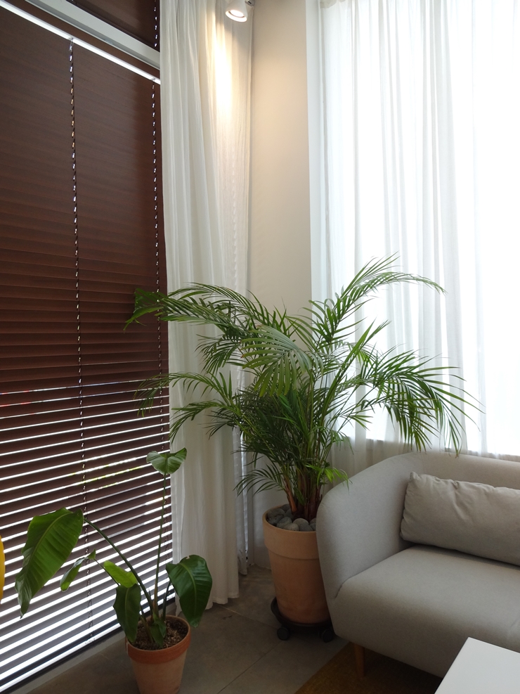 상방향으로 조절된 우드블라인드 날개는 실내 채광, 조명광을 들여보내주는 방식으로 시선만 차단하는 효과로 사용합니다.