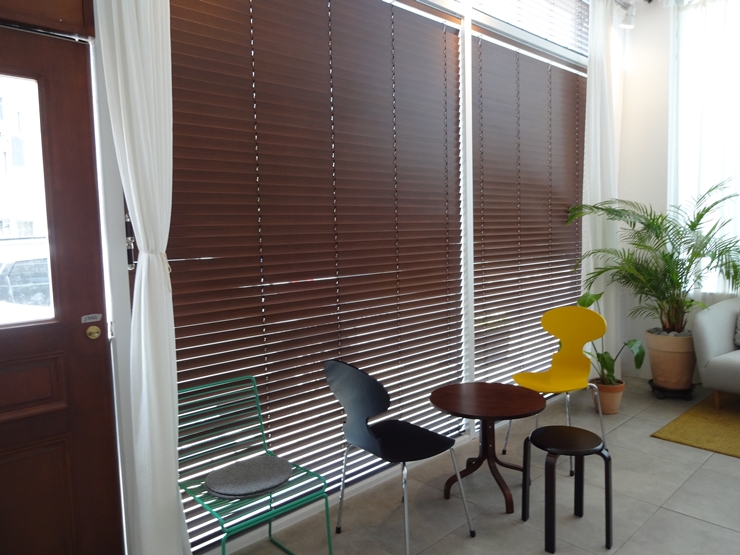 원목 나무 색상을 기본으로 하지만 다채로운 파스텔 색상 또한 구성되고 인기있는 우드블라인드 색상이 있답니다. 그 중에서 차분하고 고급스러운 느낌을 만들어 주는 진 브라운 (밤색) 우드블라인드 색상을 선택하고 카페 공간을 꾸며보았답니다.